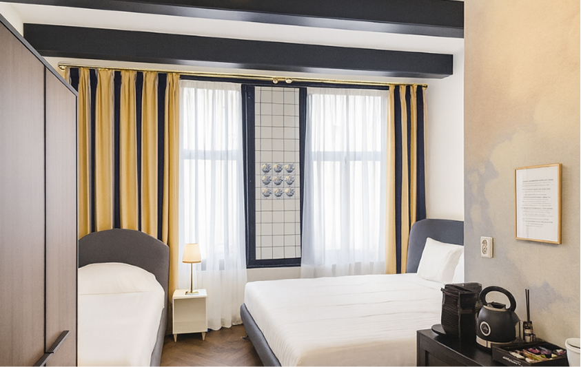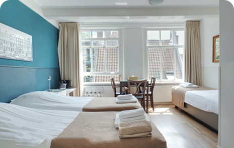 But we’re not only about history. Each of our rooms is thoughtfully designed to combine tradition with today’s essentials: free Wi-Fi, comfortable beds, private bathrooms, and a welcoming ambience. With our friendly staff always ready to help, you’ll feel right at home in Amsterdam’s most iconic setting.